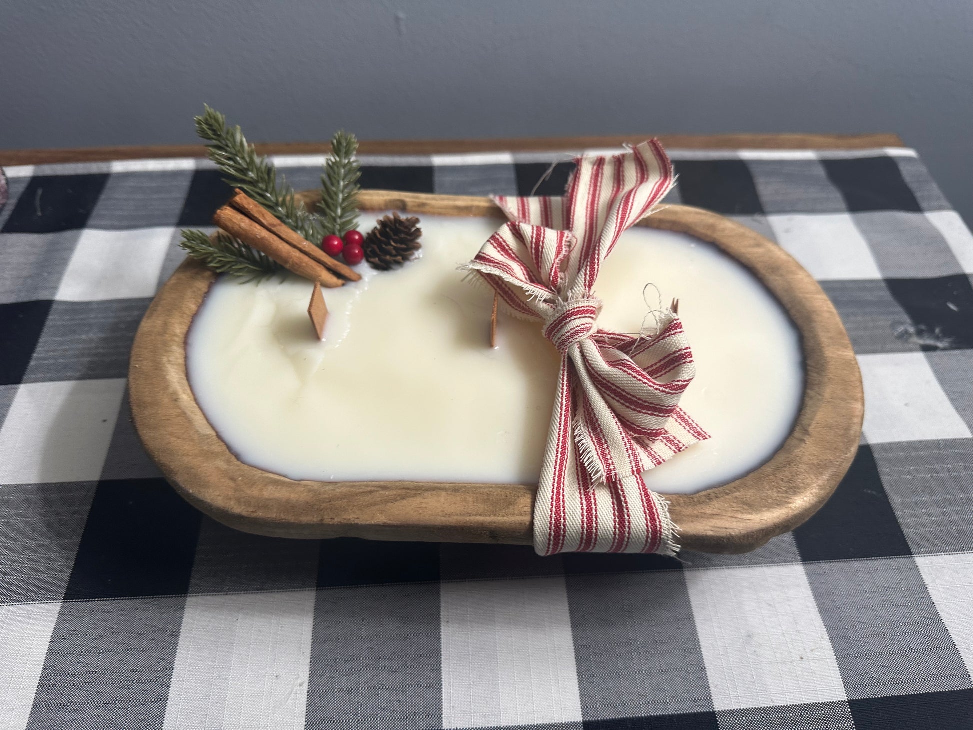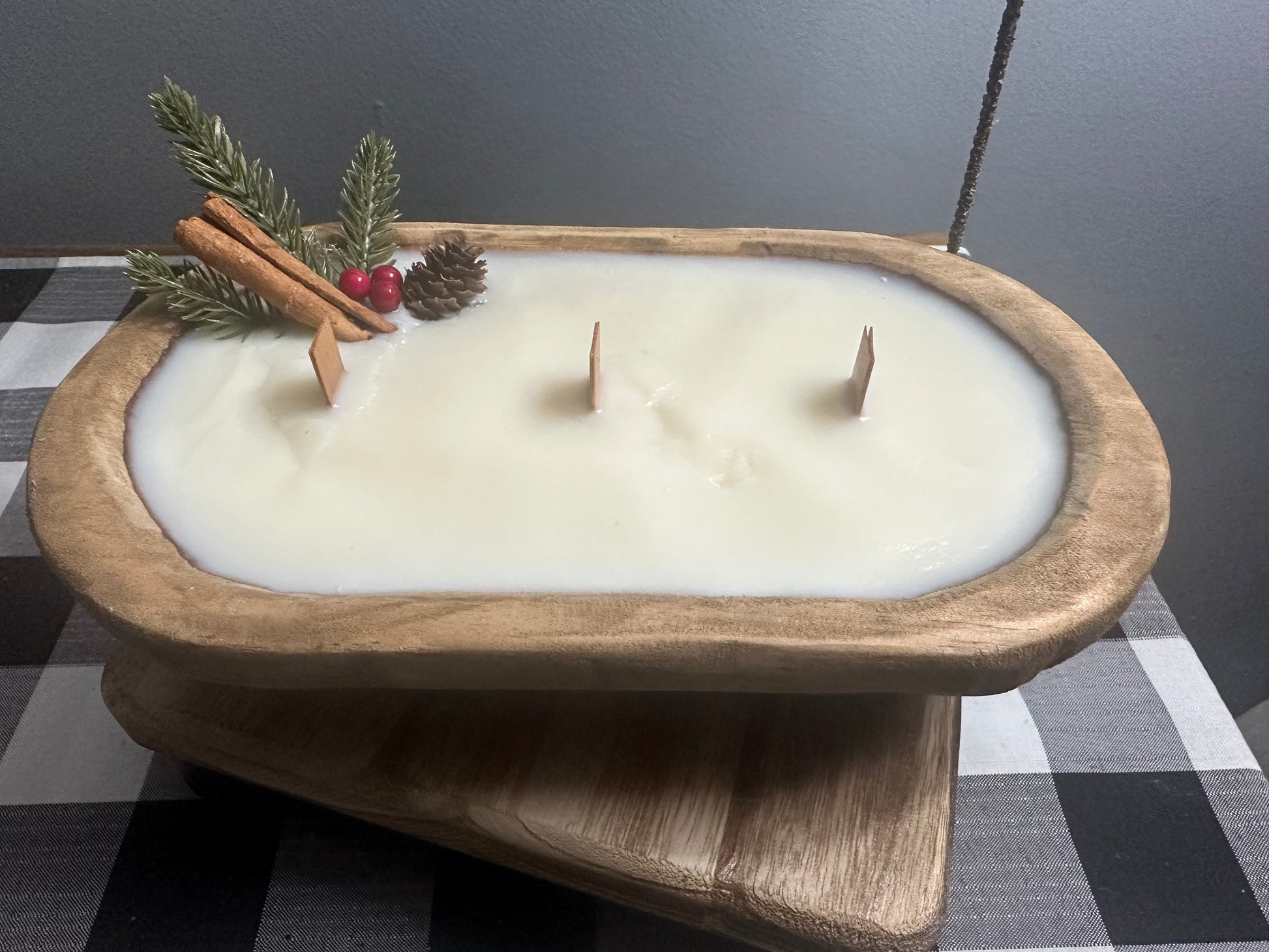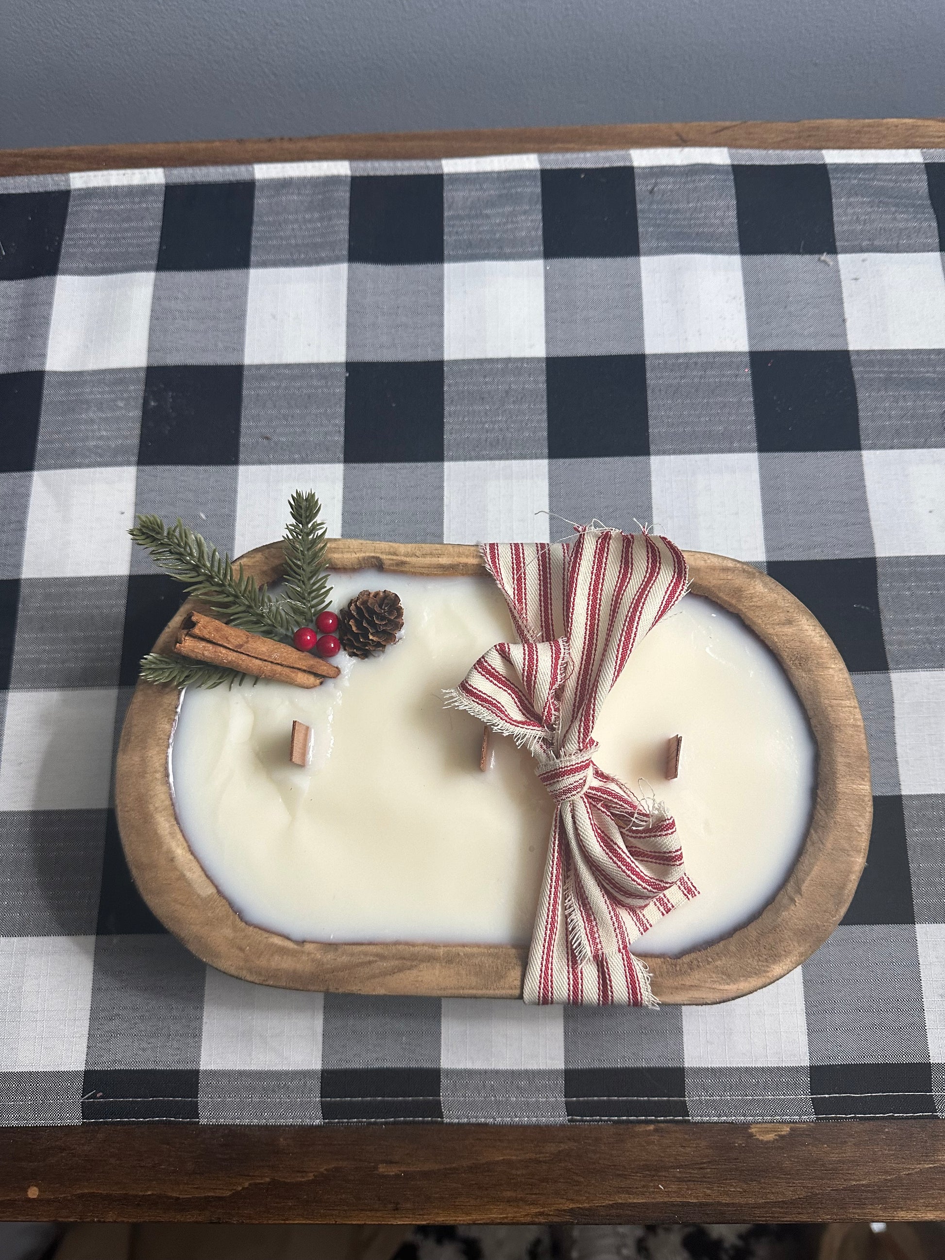 Our oval dough bowl candles all have 3 wooden wicks. Each candle has pine sprig, berries, cinnamon stick and pine cone to give that cozy winter beauty. Each candle comes adorned with a ticking bow that must be removed prior to lighting.