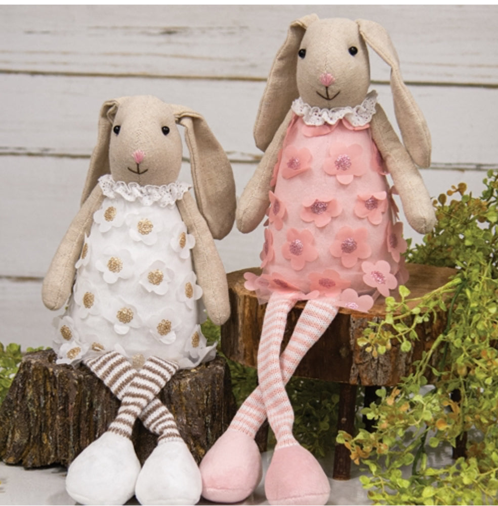 The Flower Dress Dangle Legs Bunny is a unique plush figure available in 2 assorted seasonal styles. Both bunnies feature a neutral-toned fabric construction complete with floppy ears, long arms, and striped dangling legs. The bunnies boast friendly facial features made from black beads and brown and pink embroidery. One bunny wears a pink dress adorned with pink flowers and rose gold glitter, along with pink shoes and pink striped legs. The other wears a white dress adorned with white flowers and gold glitter, along with white shoes and brown striped legs. Each measures 17” high by 6” wide by 3.5” deep.
