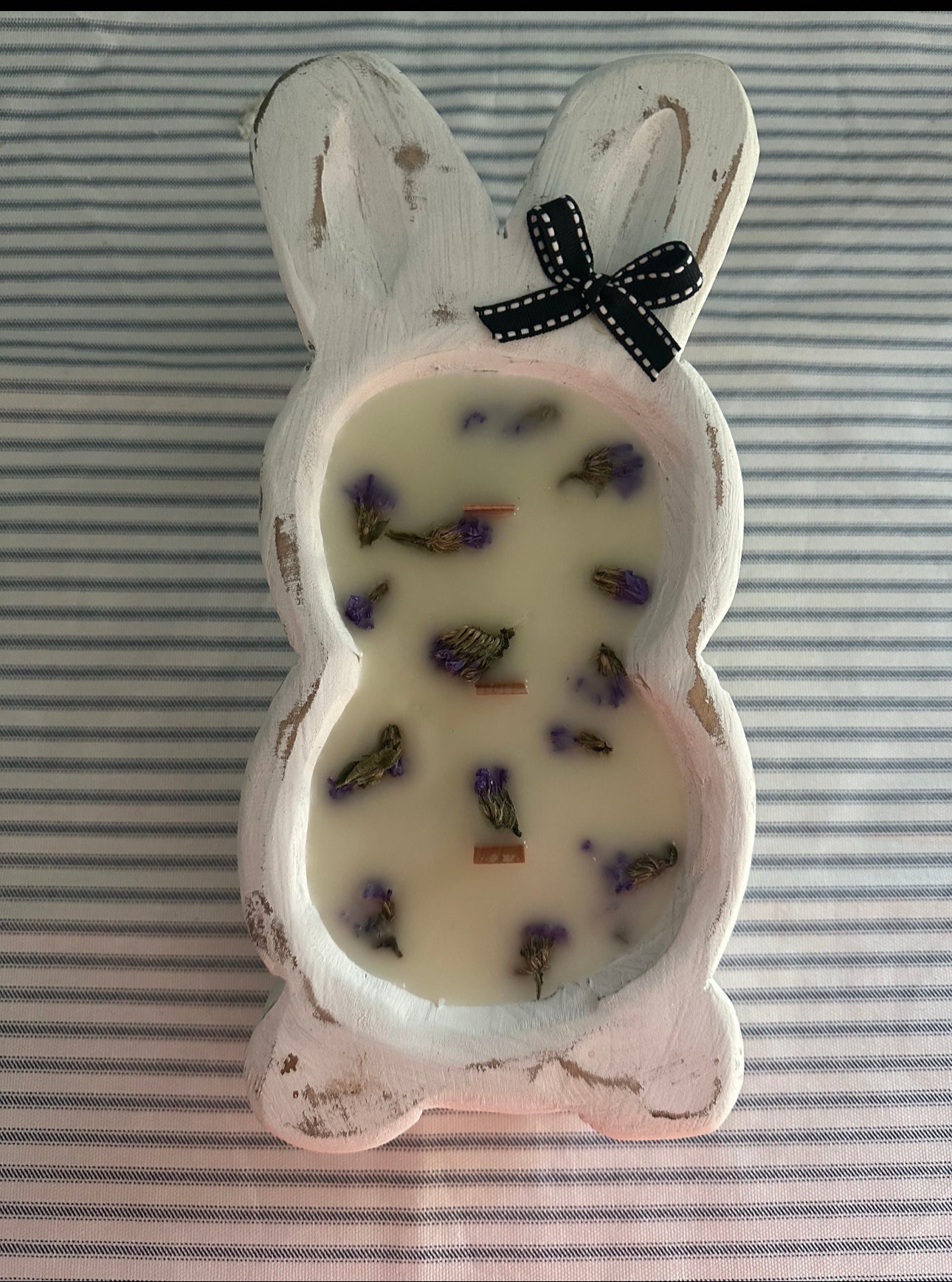 Our small bunny dough bowl candles all have 3 wooden wicks. Each candle has dried lavender buds and a bow.
