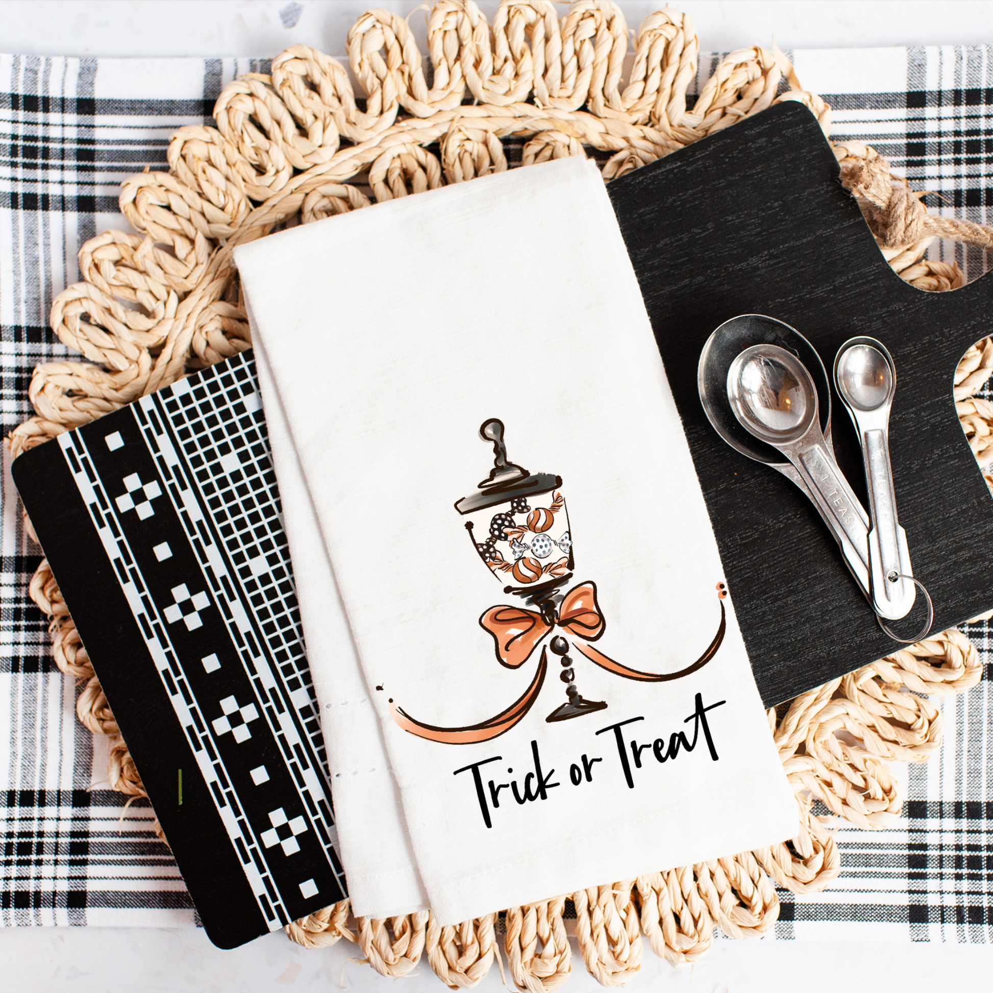 Keywords / Tags: Halloween tea towel, farmhouse Halloween décor, candy jar kitchen towel, Trick or Treat towel, fall hostess gift, No Place Like Home by Michelle